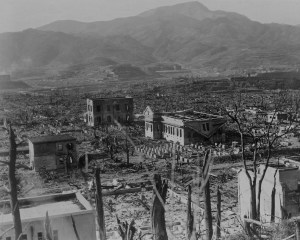 [Hiroshima newsreel] “Hiroshima, seen from the air after the atomic bomb blast that virtually erased this city of 340,000 people from the Earth. As far as the eye can see stretched scenes of desolation and ruin – four square miles leveled by one bomb – the product of a live science and a climatic answer to the terror and aggression let loose on the world by Japan.”