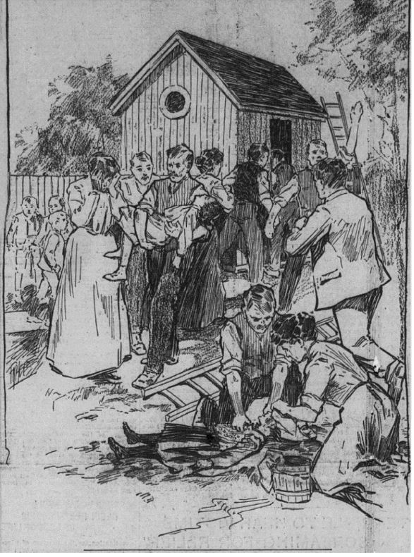 The implication of John Steinkamp’s insistence that one of his daughters is still down in the vault hits the crowd. So two men, 20-year-old William Schultz and 18-year-old John Corell, who had been two of the first on the scene and assisted with Simmerman’s rescue efforts, heroically volunteered for the terrible task of climbing down the ladder and actually wading into the cesspool to search for bodies.